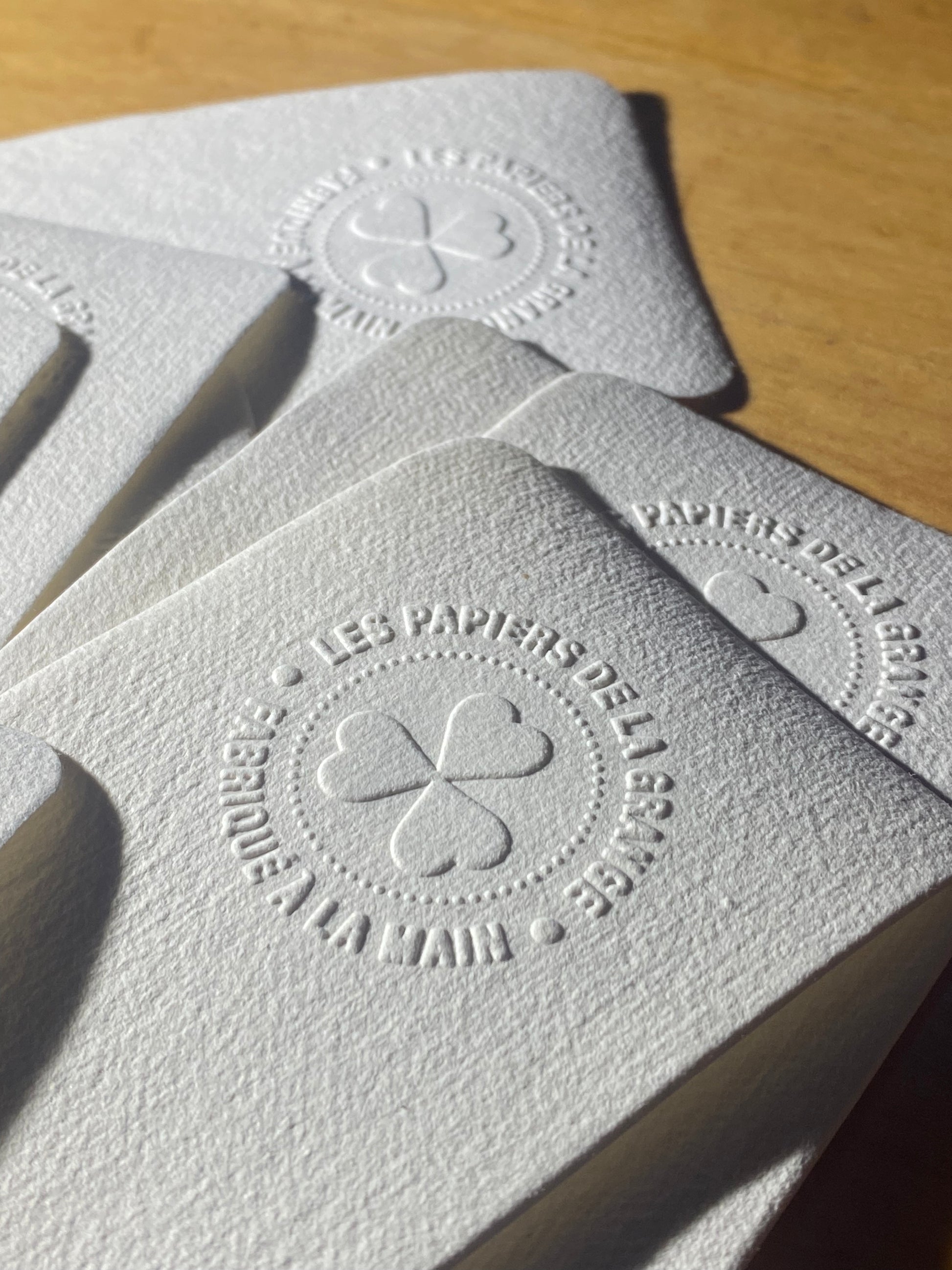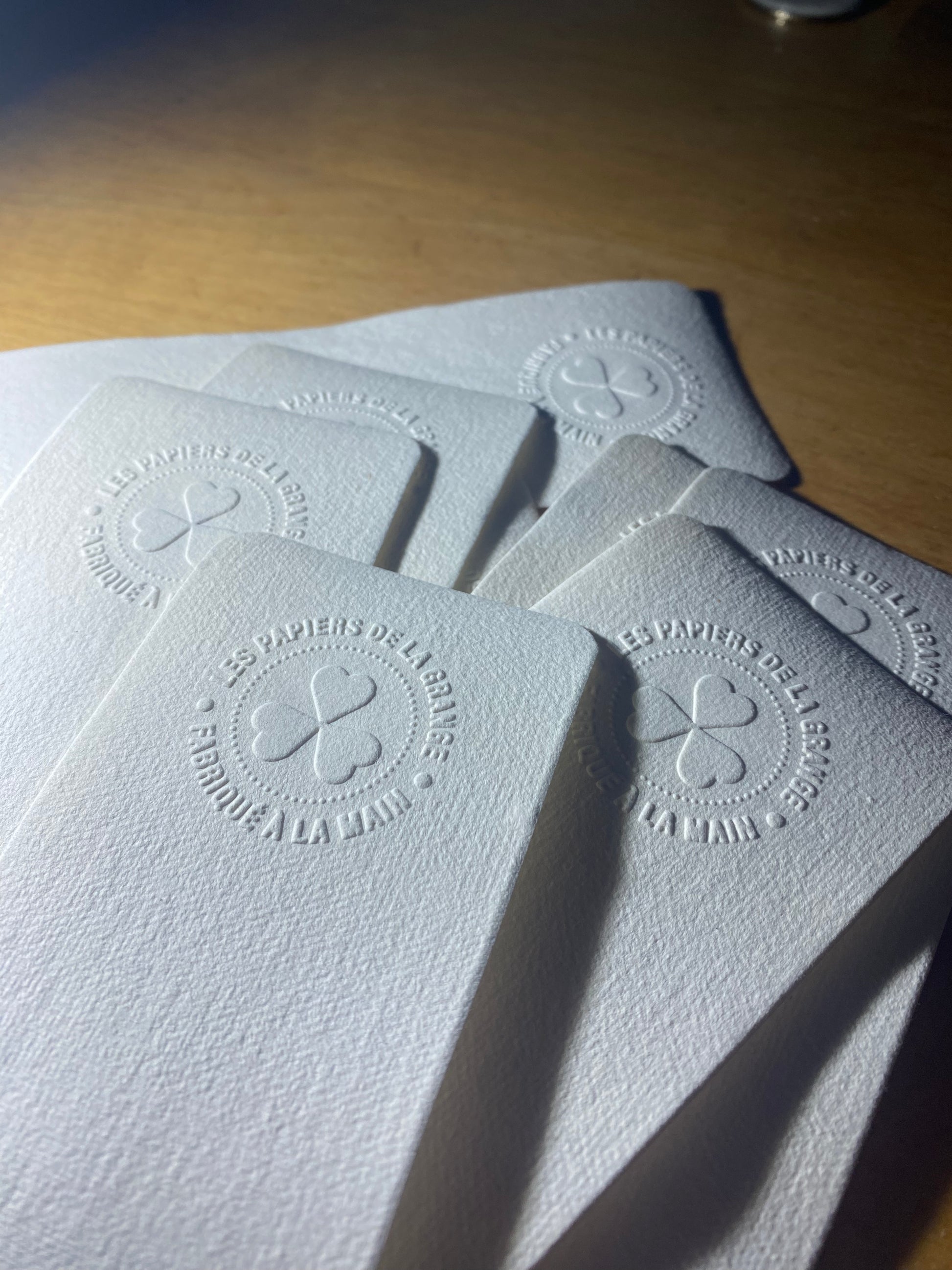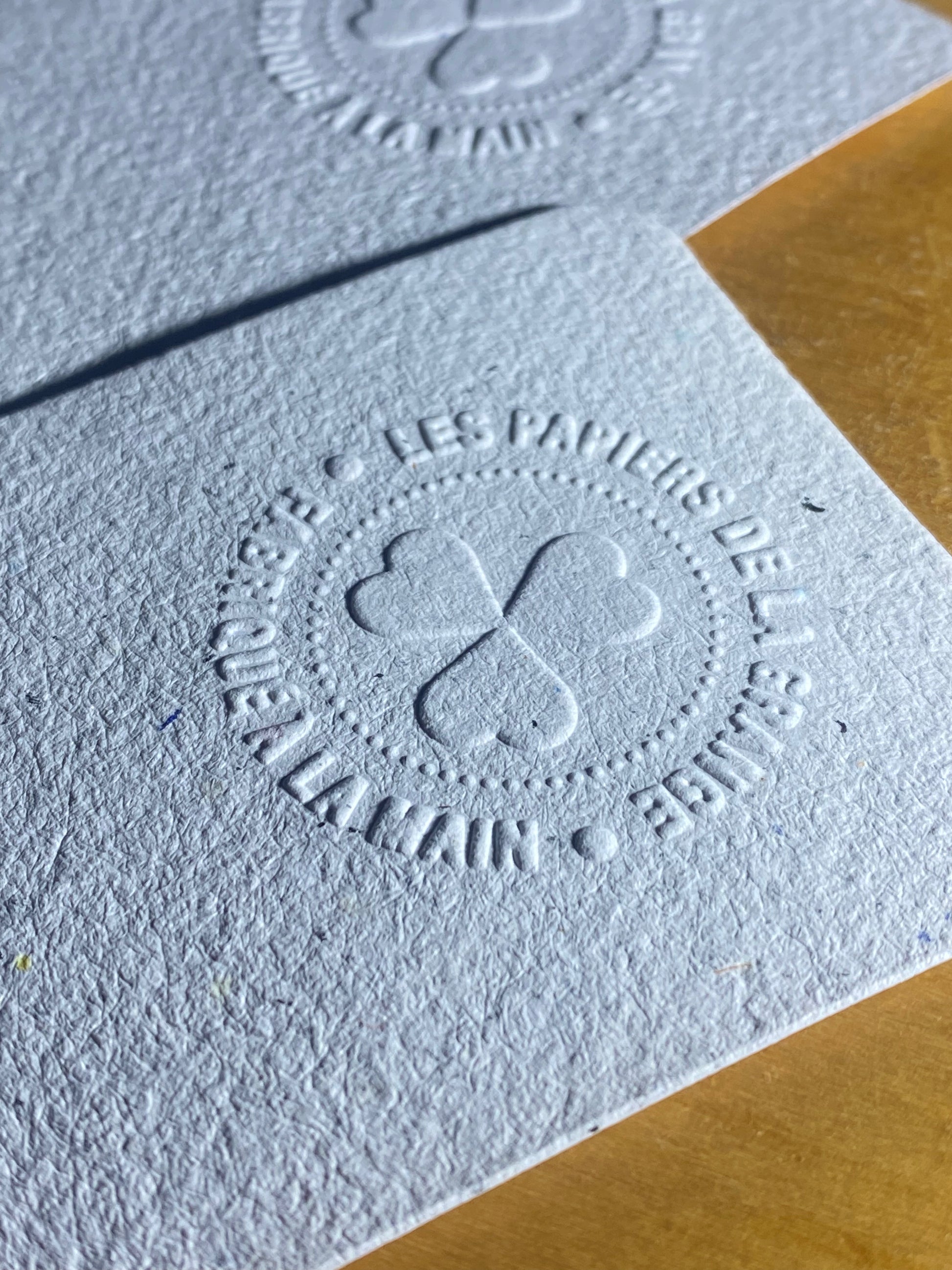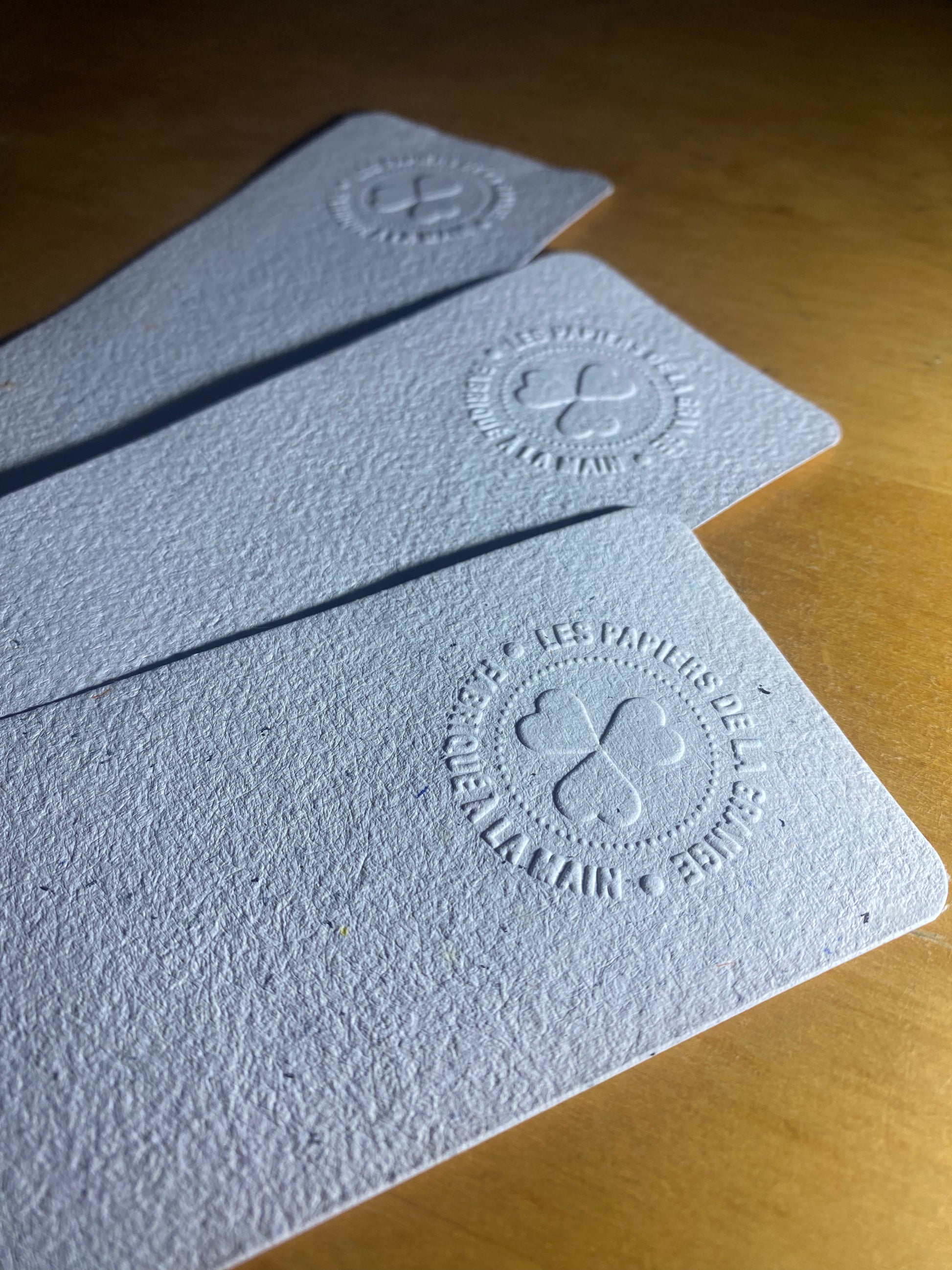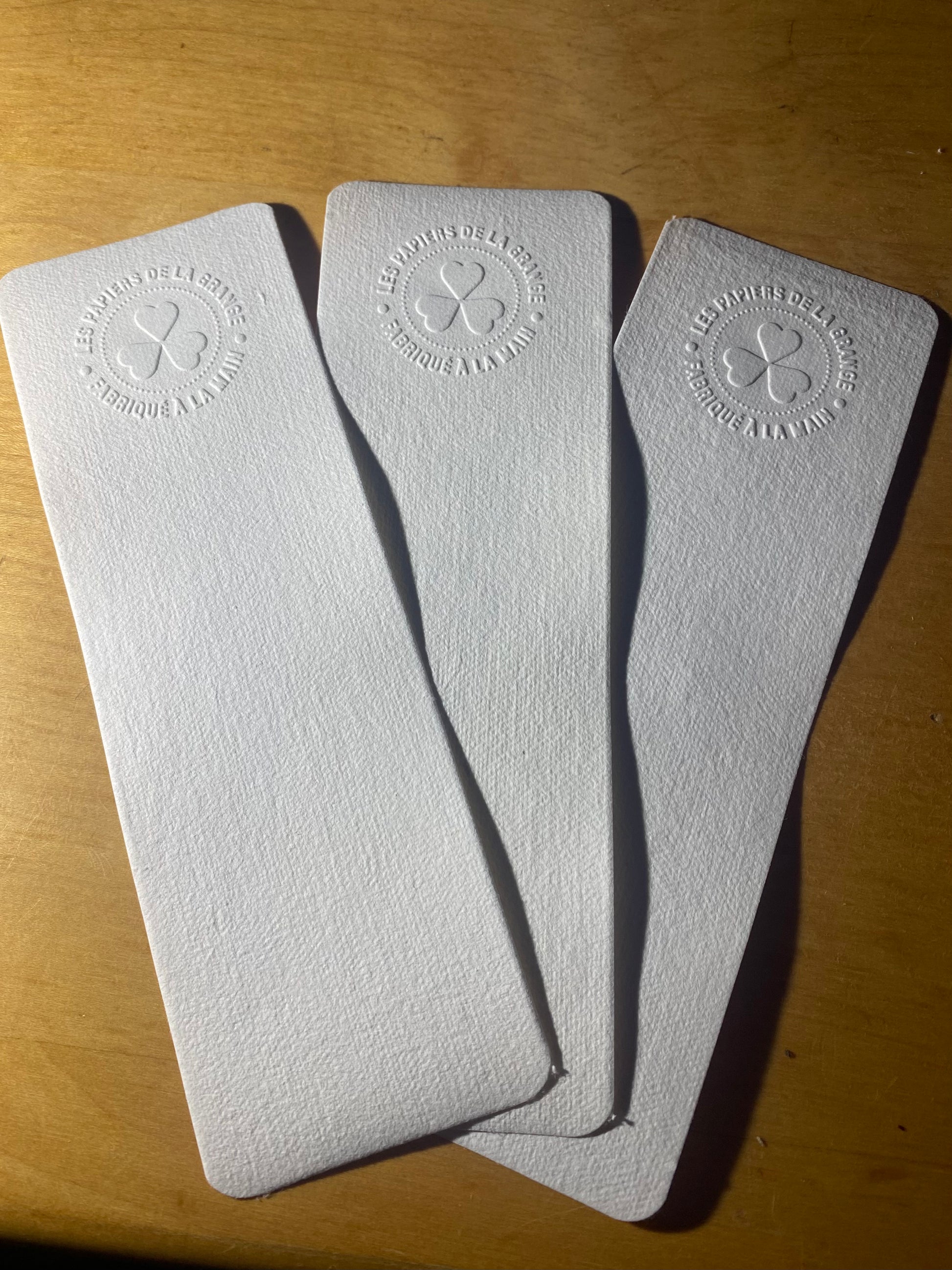Marque-pages avec inclusion de végétaux. Chaque pièce est embossée avec le filigrane des Papiers de la Grange et l'appellation "fabriqué à la main".