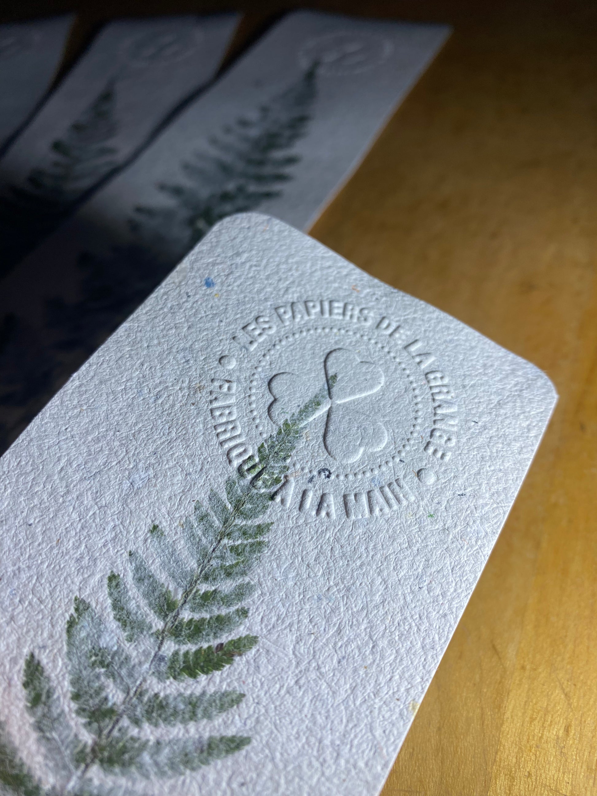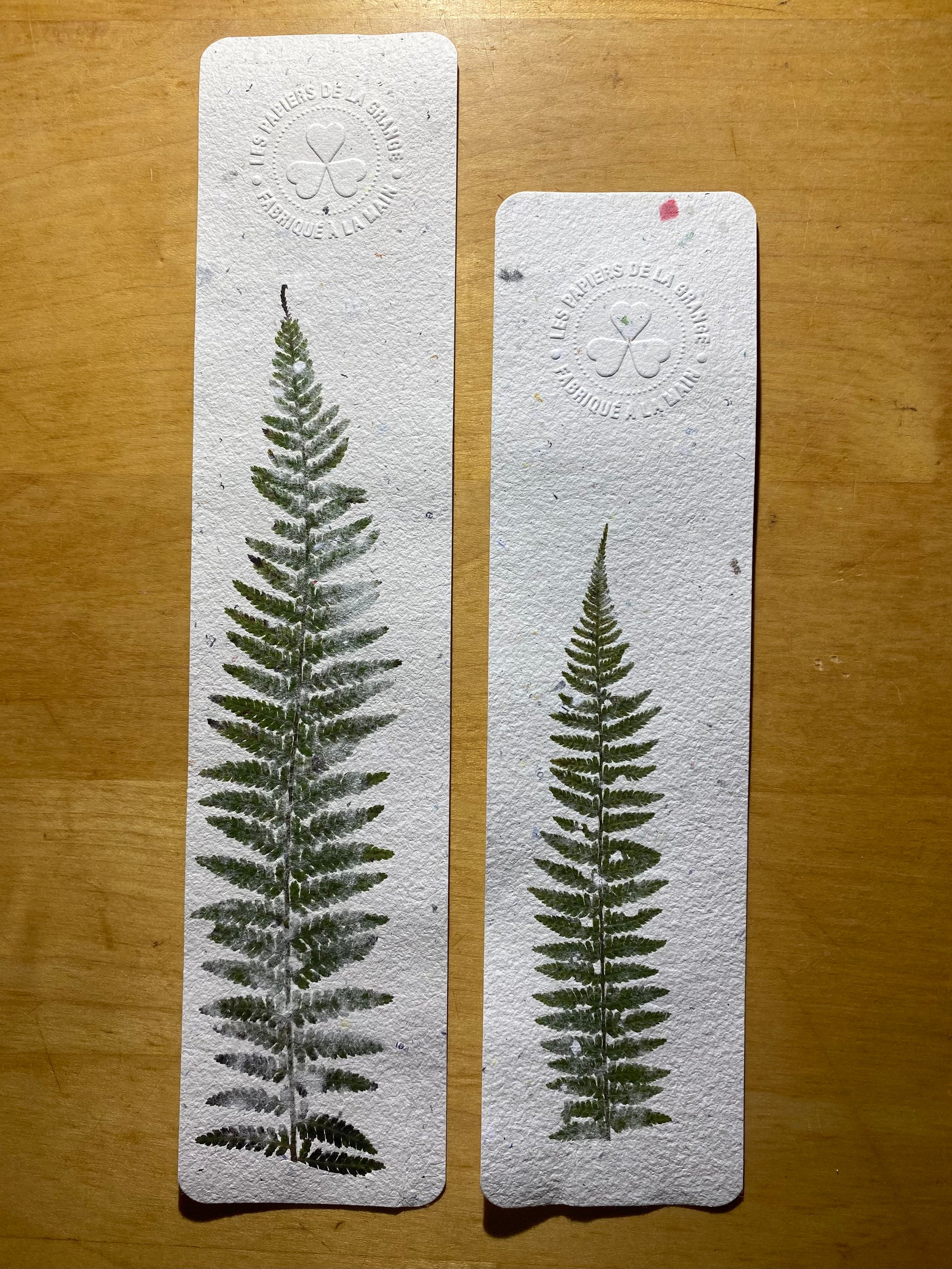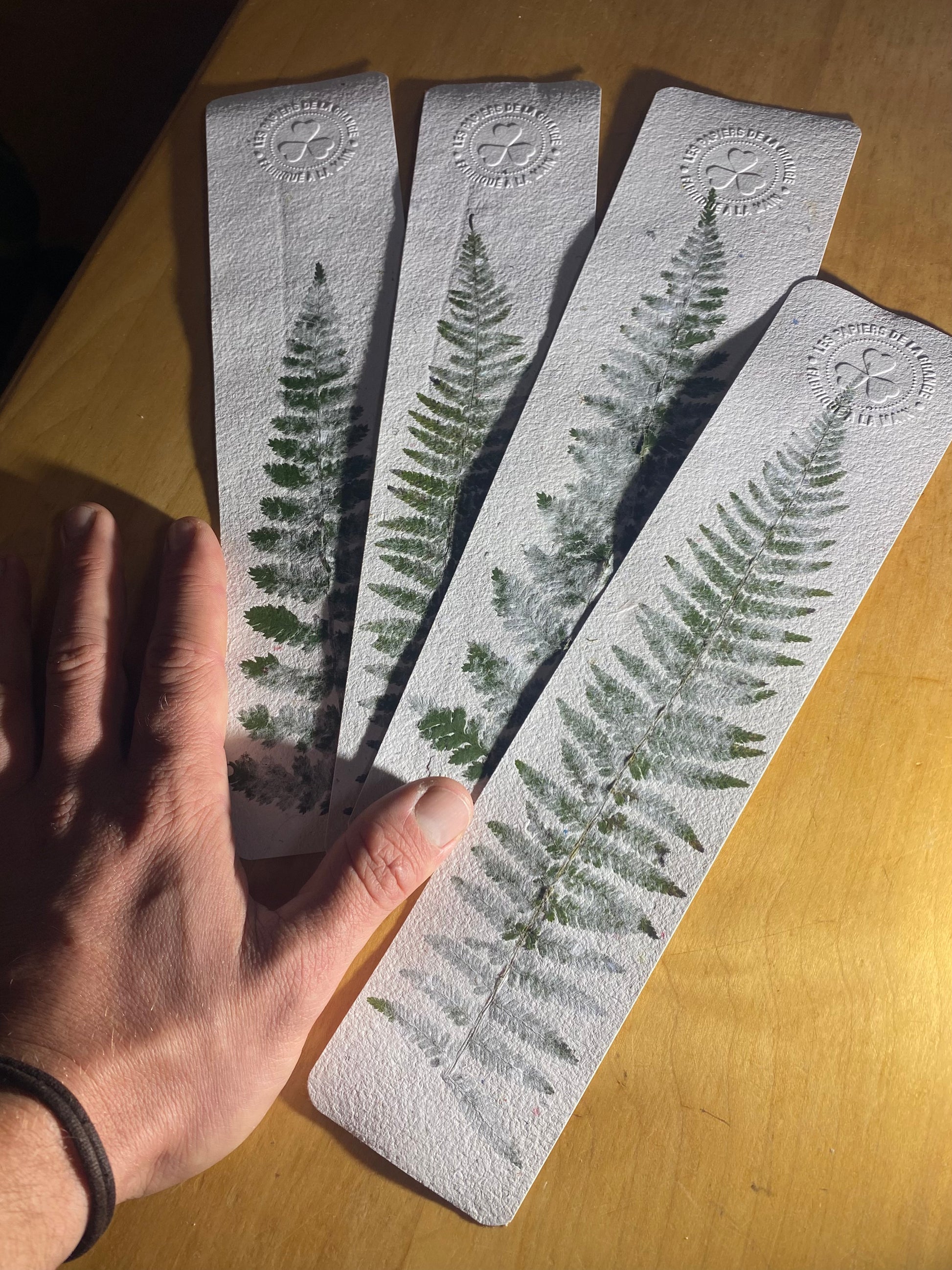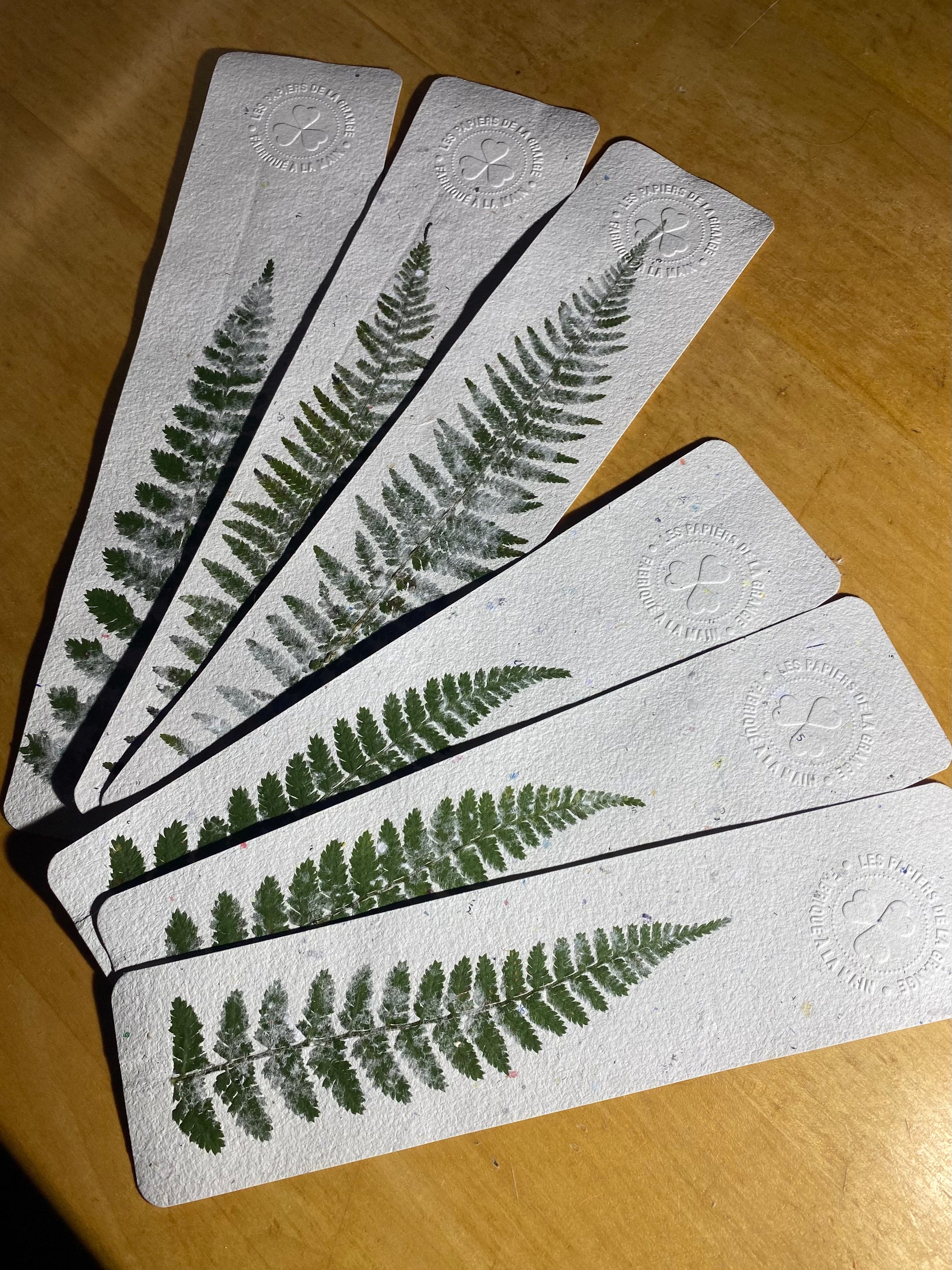 Marque-page en papier recyclé avec inclusion unique de fougère géante.