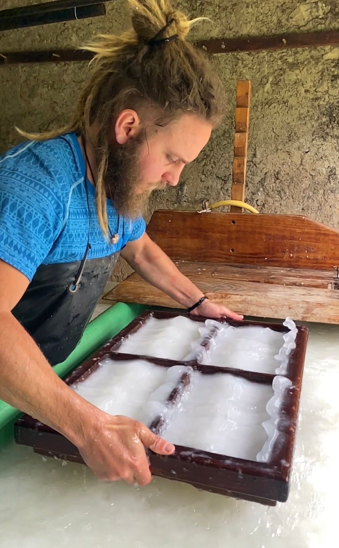 Papier fabriqué à partir de fibres de coton et de bisulfite; idéal pour l'écriture et l'impression. Fabriqué avec une forme vergé.